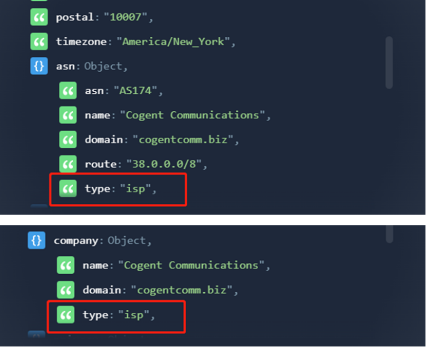 当这两个字段的 type 均显示为 ISP 时,该 IP 通常被视为双 ISP 架构。
