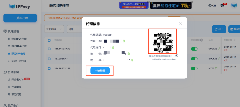 点击后会显示该IP的代理类型、主机、接口、联号和密码,可点击复制需要的信息,配置到对应工具里,或者直接扫描出现的二维码进行配置,避免手动的纰漏。