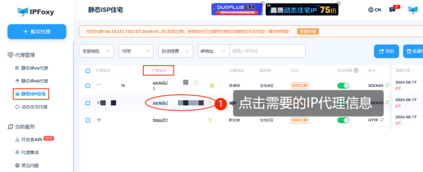 进入代理IP管理页,一般提供了完整的代理信息。比如我选了IPFoxy里的静态住宅IP,点击代理信息旁边的复制图标。