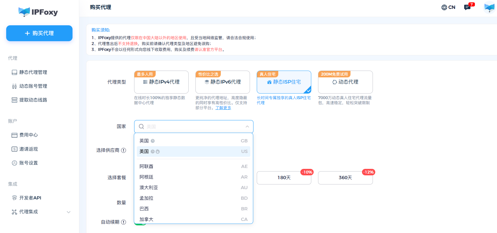 - 在IPFoxy上选择上述推荐区域的住宅 IP 节点或专用独享节点,甚至可以按需求选择原生IP资源,配置到手机,更加真实有效。