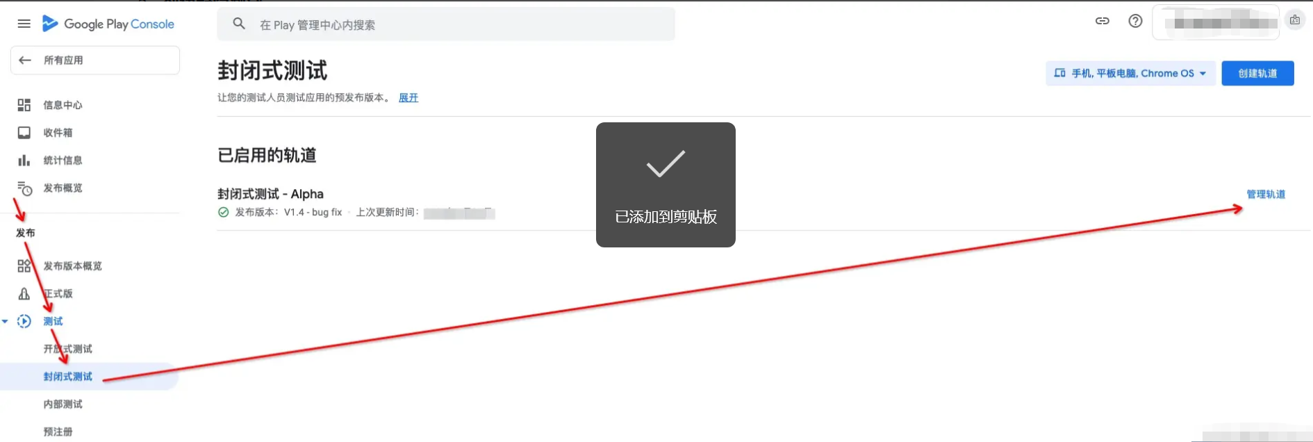 在控制台中选择你要测试的应用,点击左侧菜单中的 “Testing”(测试),然后选择 “Closed Testing”(封闭测试)。