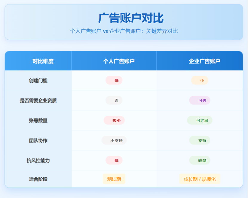 - 企业广告账户:适合长期、规模化投放