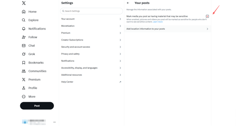 取消勾选「Mark media you post as containing sensitive material」