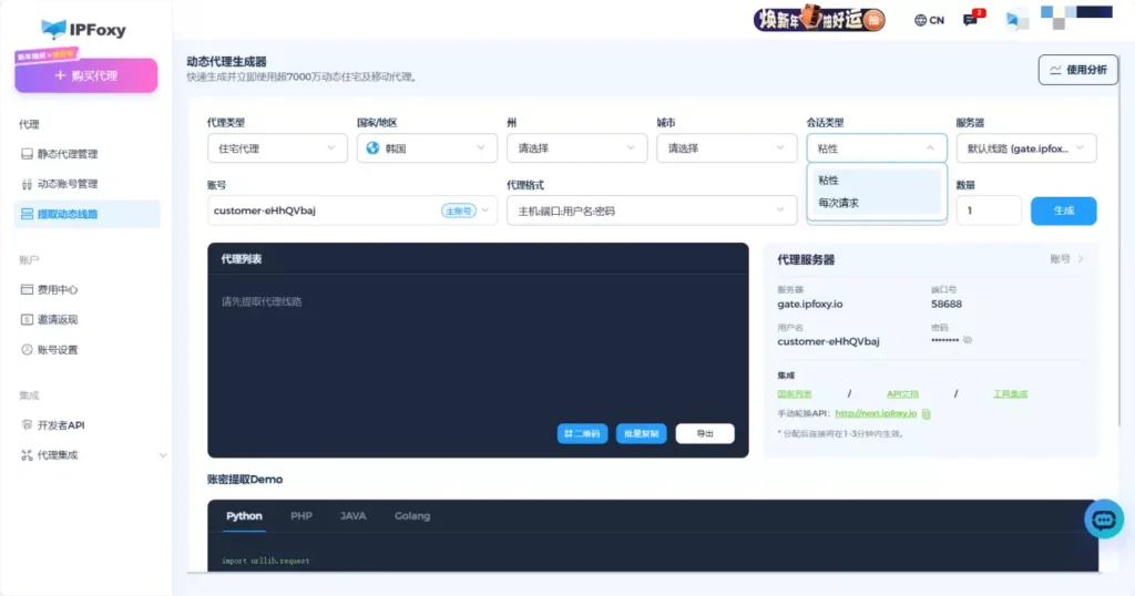 通过动态代理控制面板,可以生成韩国动态住宅/移动IP,支持按请求或按时间自动切换出口 IP。在批量抓取场景下,这种方式更利于维持访问稳定性,同时减少风控触发概率。