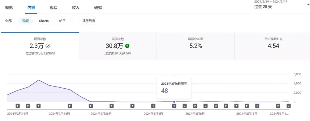 如果视频发布后,曝光量曲线像撞了墙一样,停在一个极低的数字就不动了,即使你的点击率很高,也说明频道被算法设置了“流量天花板”。