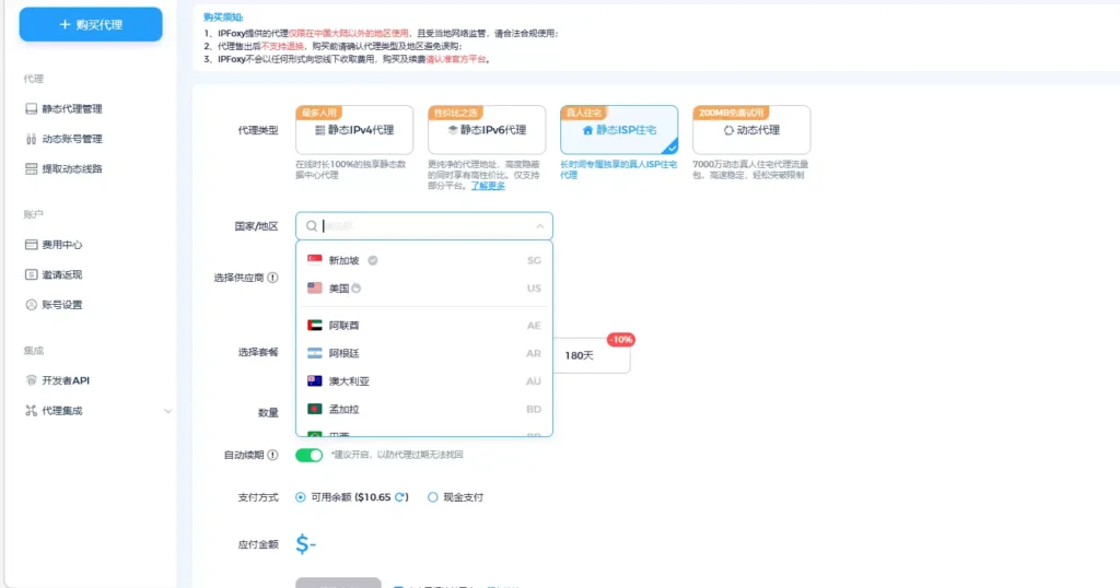 - 固定纯净 IP:不要频繁更换节点和使用共享机房代理,建议切换到高纯净度的静态住宅代理,例如从IPFoxy获取的静态住宅IP,真实纯净度高账号成活率高,搭配独享设备并且不要轻易变更。
