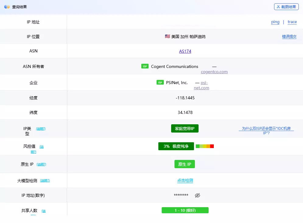 - 检查IP信誉分:历史行为和信誉分析是验证代理IP纯净度的另一关键步骤。使用过于频繁或被多次用于恶意行为的IP容易被平台列入黑名单,从而导致被封禁的风险。市面上没有客观的统一标准,下面我们用市面上常见的检测网站对IPFoxy检验,可以看出IPFoxy 的原生静态住宅 IP 具备高纯净度与静态稳定性,能有效避免因机房 IP 被列入风控黑名单而导致的关联降权。