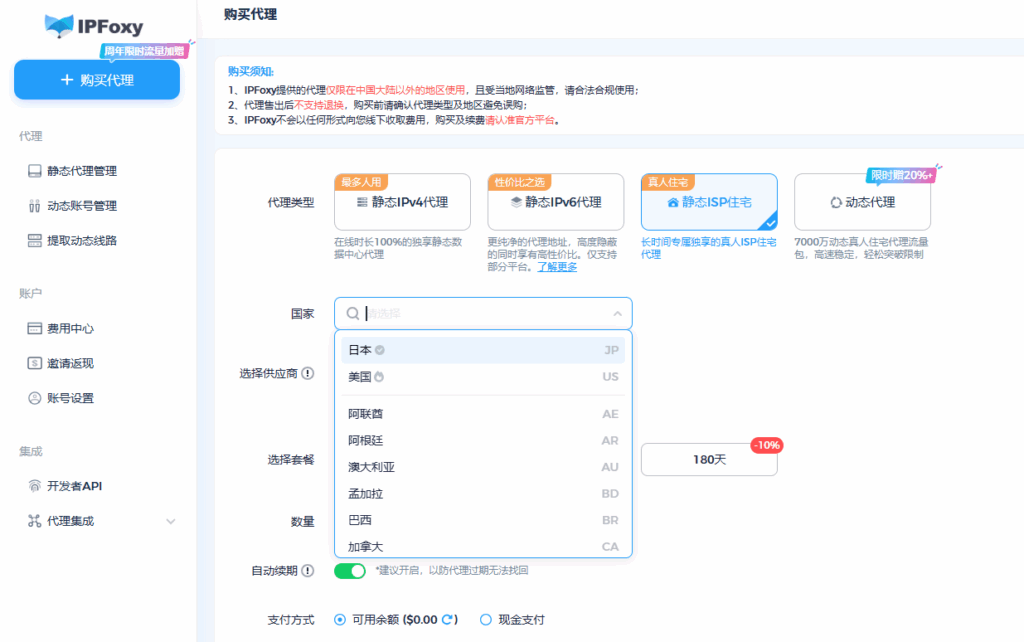 IPFoxy提供覆盖全球的住宅级别IP代理,为每个账号提供独立、纯净的IP,降低关联风险,并且能够配合指纹浏览器进行使用。